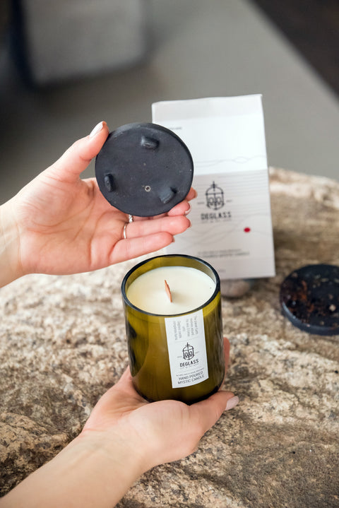 natūralus sojų vaškas, medinė dagtis, eterinių aliejų kvapo formulė, kurta parfumerio, laikantis mūsų ideologijos, rankų darbo keramikos dangtelis - kaskart nepakartojamas, stebina unikalumu ir antrinio panaudojimo stiklo indas, kuris gyvena dar kartą.